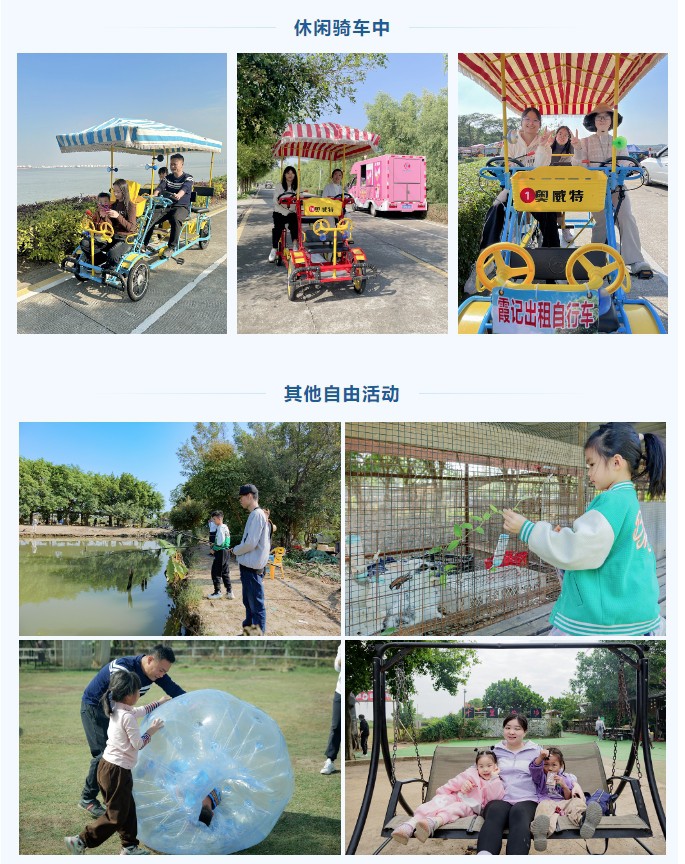 下午,大家在農場內自由活動。體驗卡丁車、釣魚、騎車游海鷗島、捕魚、打野戰等豐富多彩的活動,享受大自然的恩賜,度過一段愉快的時光。